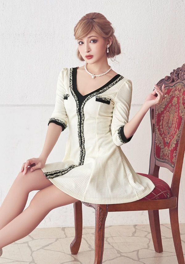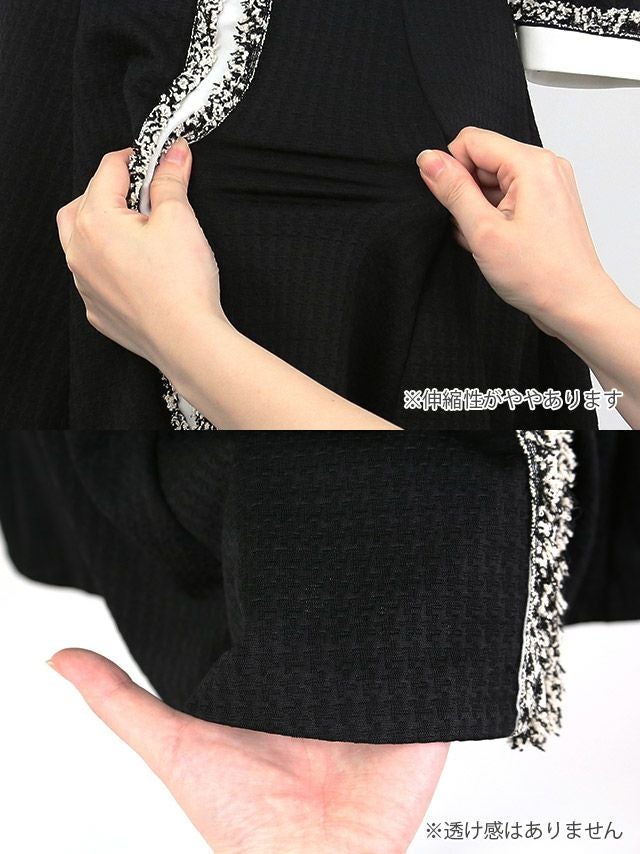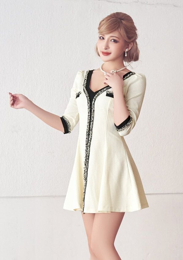 落ち着きのあるガーリースタイルに♪ [韓国ドレス] ミニドレス ワンピース 異素材 モノトーン 袖あり 七分袖 ツイード Aライン キャバドレス (ゆんころ着用) [tk-mdkwt-2077b]
