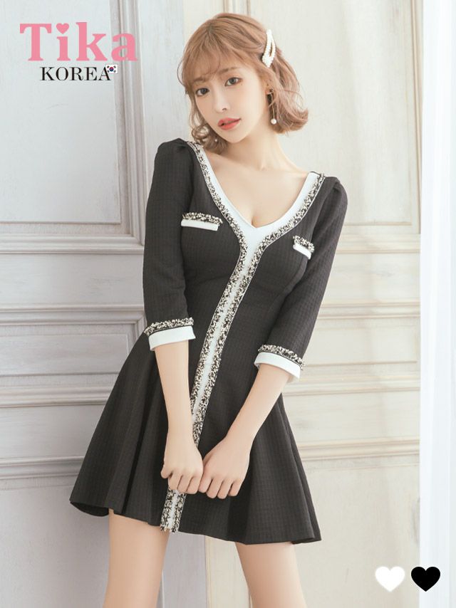 5. [韓国ドレス] ミニドレス ワンピース 異素材 モノトーン 袖あり 七分袖 ツイード Aライン キャバドレス (ゆんころ着用) [tk-mdkwt-2077b]