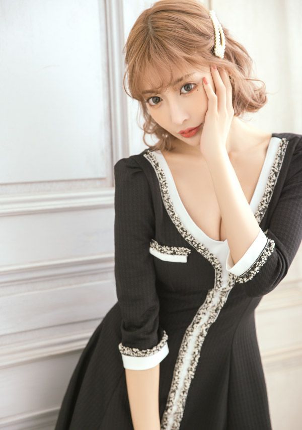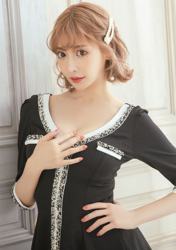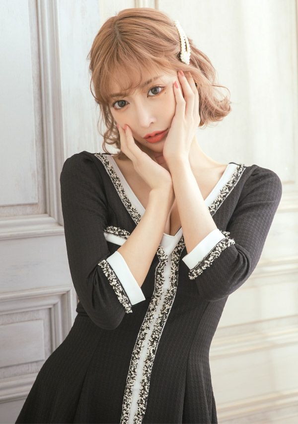 4. [韓国ドレス] ミニドレス ワンピース 異素材 モノトーン 袖あり 七分袖 ツイード Aライン キャバドレス (ゆんころ着用) [tk-mdkwt-2077b]