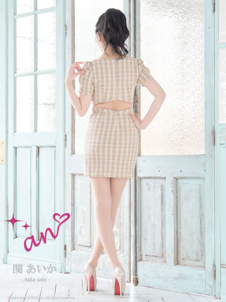 キャバドレス an アン 高級チェーンチャームフロントジップチェック柄半袖ツイードスクエアネックデザインポケットタイトミニドレス