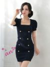 3. [an/アン] 高級チェーン付き半袖パフスリーブスクエアネックダブルボタンツイードタイトミニドレス