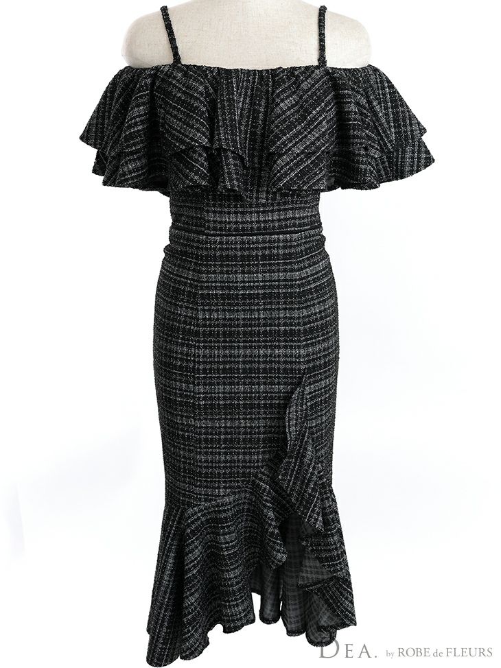 ガーリーにもセクシーに着こなせる☆ [DEA.byROBEdeFLEURS/ディアバイローブドフルール] 高級オフショルダー胸元フリルツイードアシメマーメイドタイト膝丈ドレス