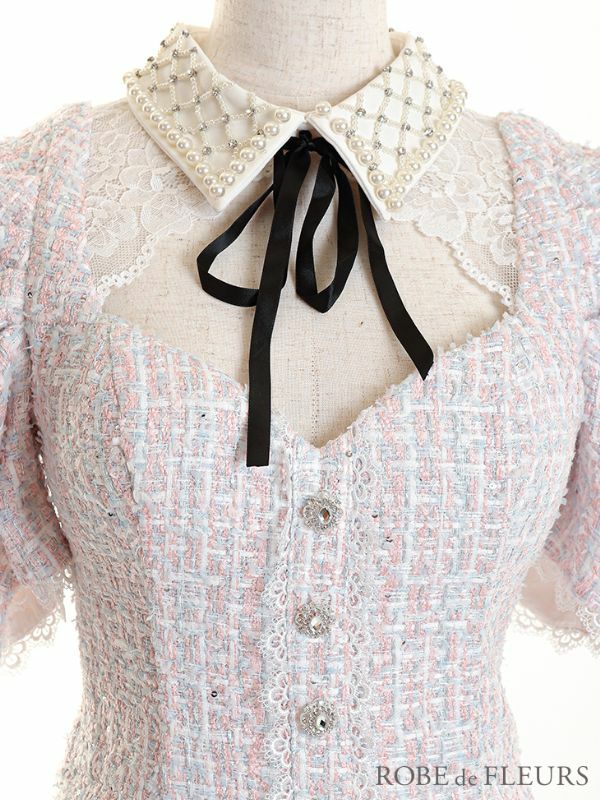 ツイードパールのクラシカルドレス☆ [ROBEdeFLEURS/ローブドフルール] 高級パール襟ツイードスカート袖ありパンツセットアップドレス