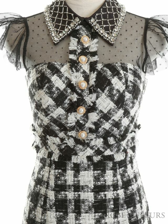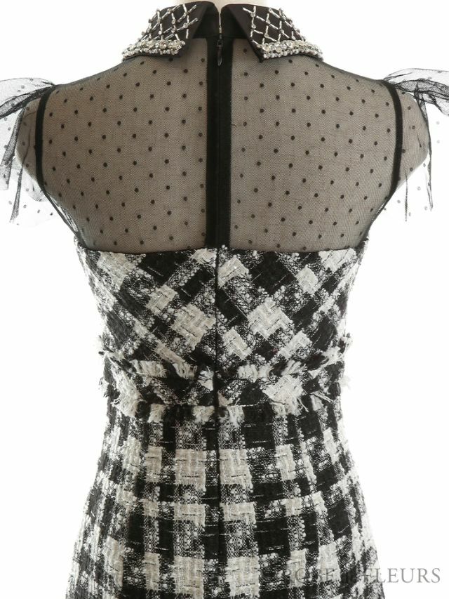 ROBEdeFLEURS ローブドフルール 高級ビジュー襟デザインラメツイードフロントボタンドットチュールフリル袖ノースリーブミニドレス