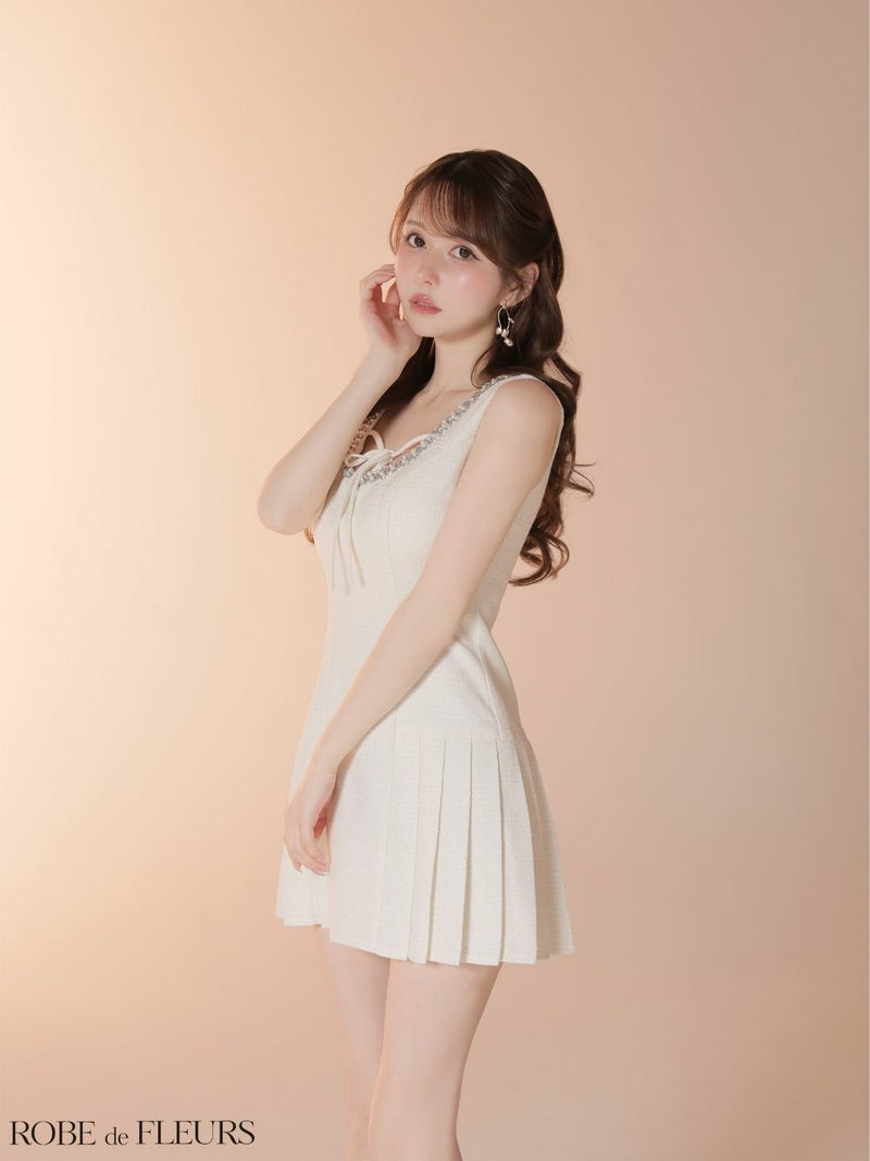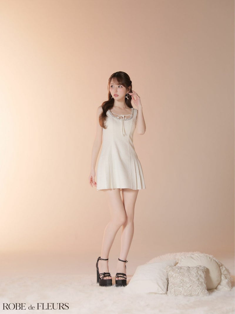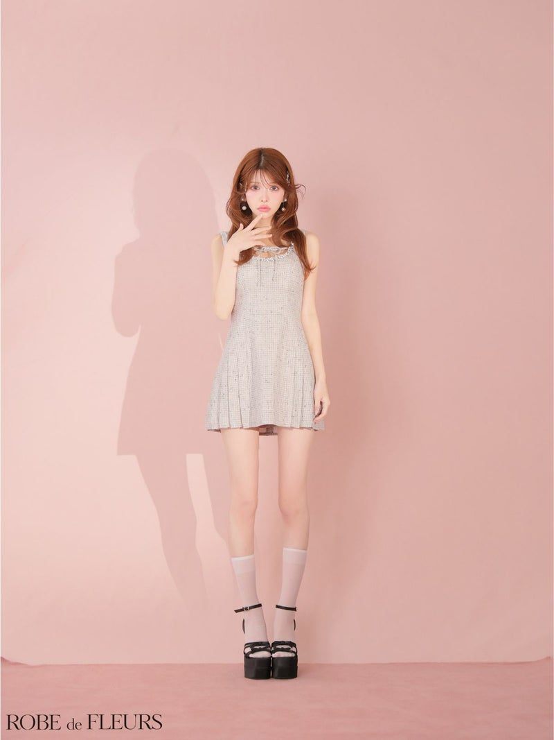 程よいフレアで美シルエットに♡ [ROBEdeFLEURS/ローブドフルール] 高級 ブランド Aラインミニドレス ノースリーブ ラメツイード 縁取りビジュー バストリボン プリーツ