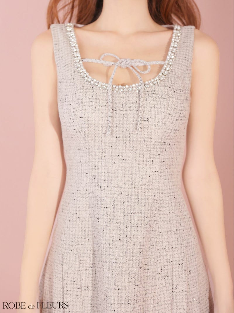 胸元のリボンが可愛さをトッピング♡ [ROBEdeFLEURS/ローブドフルール] 高級 ブランド Aラインミニドレス ノースリーブ ラメツイード 縁取りビジュー バストリボン プリーツ
