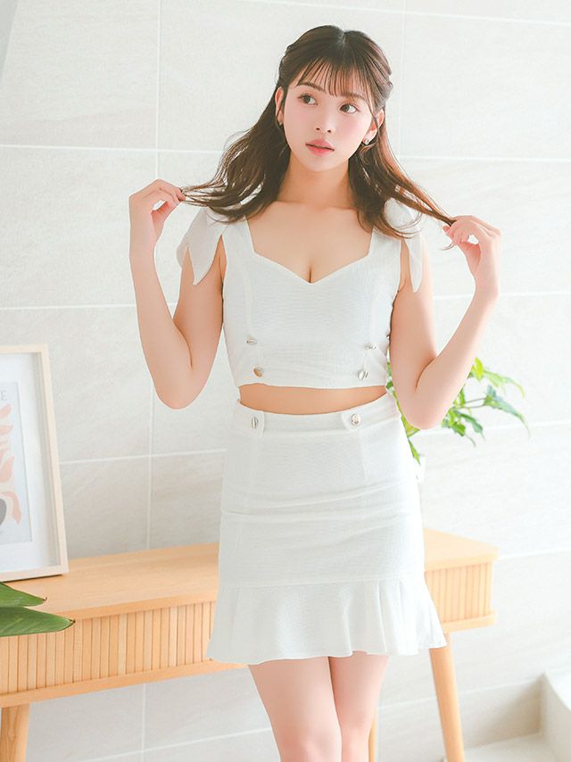 ノースリーブ リボン ダブルボタン ストレッチ 裾フリル セットアップ 谷間魅せ タイトミニドレスの商品特徴