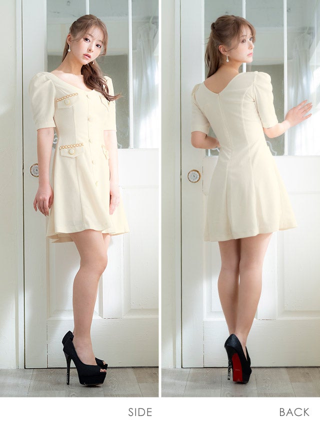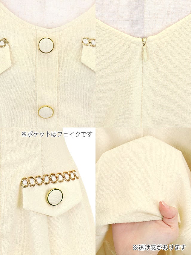 4/9新作★上品さと甘さが絶妙にミックスされた1着♡ [韓国ドレス] ワンピース Aライン ミニドレス 袖あり フロントボタン ゴールドチェーン フェイクポケット ストレッチ 胸元カバー 下着のまま 同伴 ベージュ キャバドレス (uka着用) [tk-mdk7104]