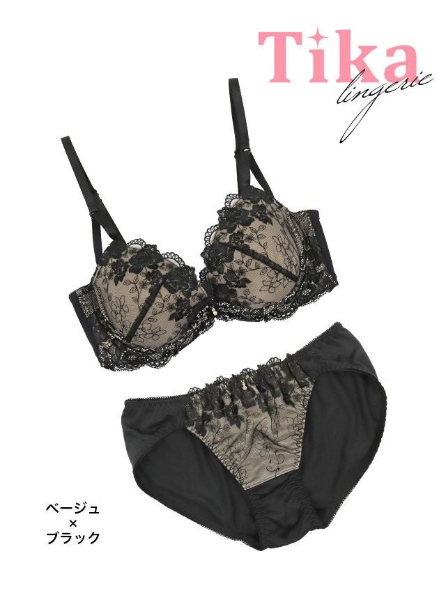 大人のエロさが増すヌーディーカラー♡ [勝負下着] ヌーディー フラワー刺繍 レース 脇高 ワイヤー ブラジャー ショーツ 2点セット