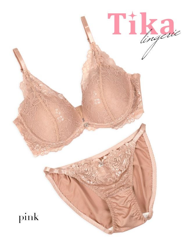 ヌーディーピンクフラワーレース脇高ブラジャー&ショーツ2点セットの詳細画像1