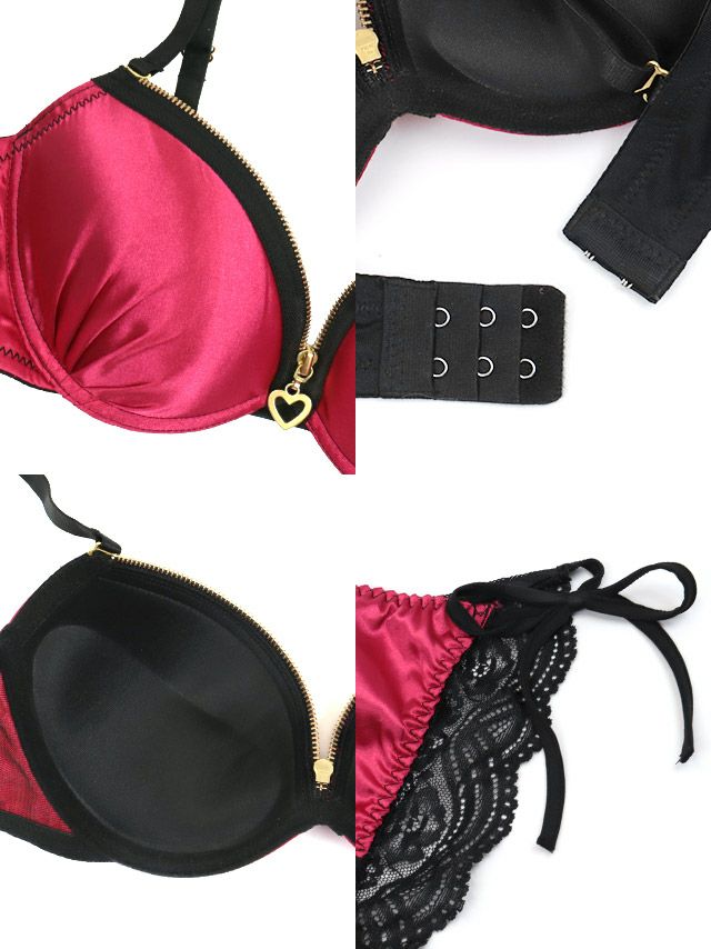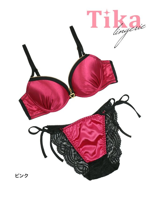 ハートチャームジップデザインサテンカップブラジャー&ショーツ2点セットの詳細画像