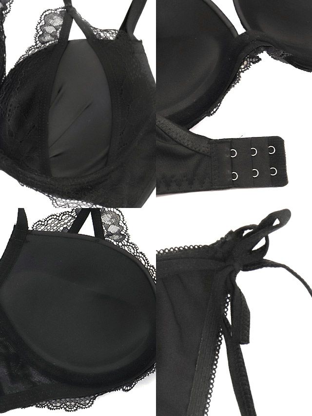 4. [勝負下着] ビジュー付きレース×サテンクロスソフトワイヤー脇高カップブラジャー&ショーツ2点セット