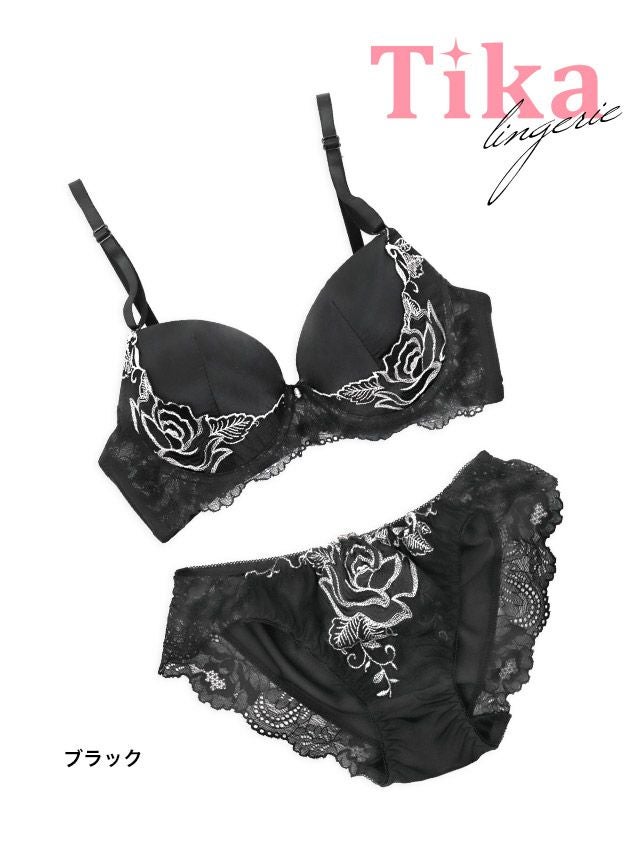 エレガントフラワー刺繍サテンカップブラジャー&ショーツ2点セットのメイン画像