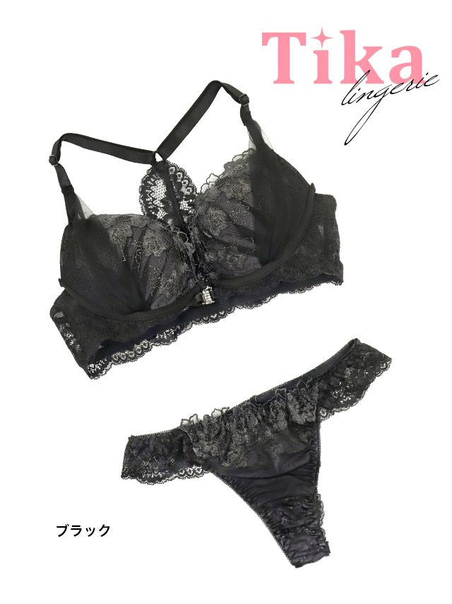 エレガントレース チュールベール フロントホック ワイヤー ブラジャー Tバックショーツ 2点セットのフロントバック