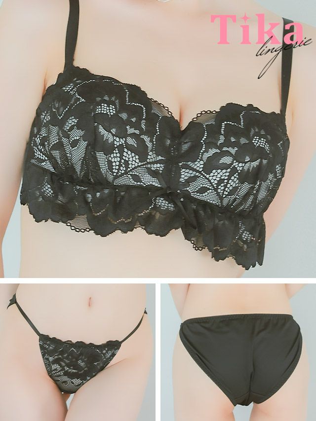 3. [勝負下着] フラワーレーシー リボン ハーフカップ ワイヤー ブラジャー ショーツ 2点セット