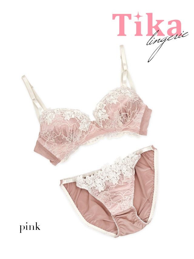 ゴージャスホワイトフラワーレースノンワイヤーカップブラジャー&ショーツ2点セット