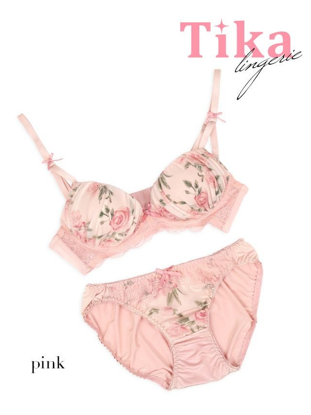 ロマンティックローズプリントノンワイヤーカップブラジャー&ショーツ2点セット