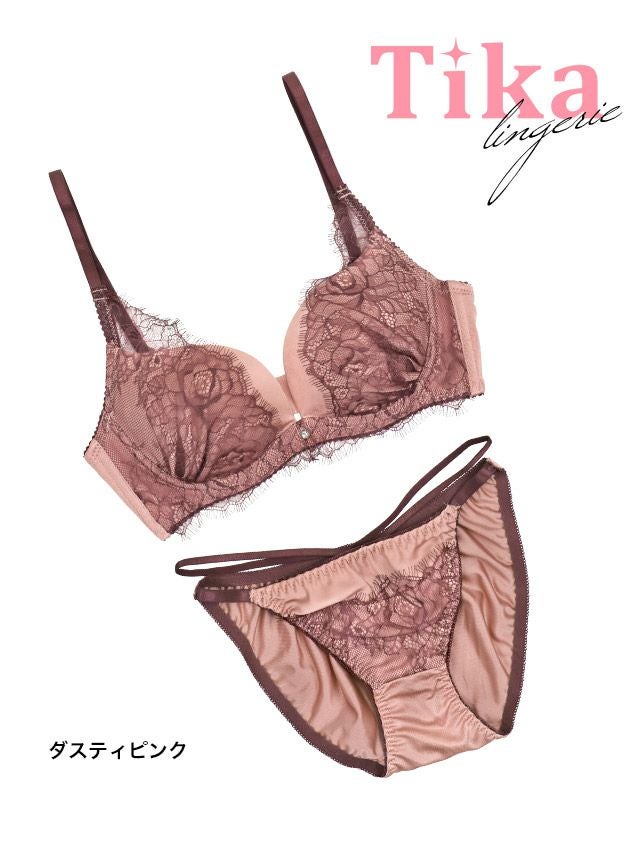 サテン アイラッシュレース レイヤード ワイヤー ブラジャー ショーツ 2点セットのフロントバック