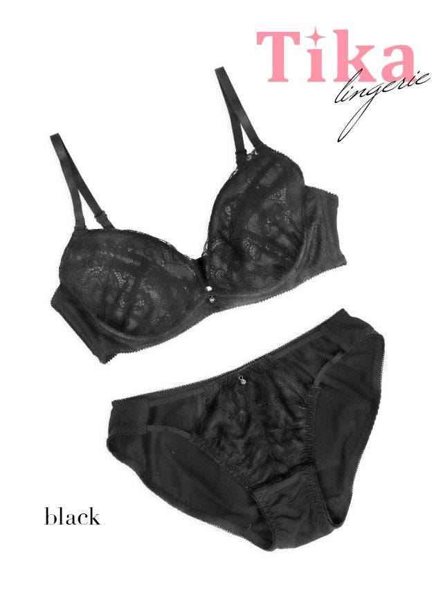 ビジュー付きブラックレースカップブラジャー&ショーツ2点セットのカラー詳細