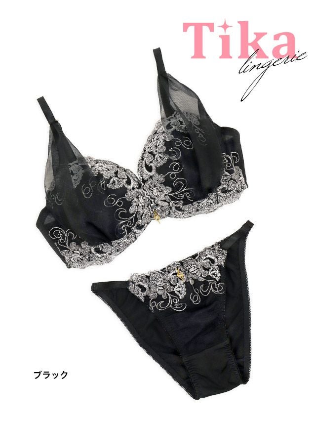 華やかなお洒落ランジェリー♪ [勝負下着] チュールベールエレガンス刺繍レース脇高カップブラジャー&ショーツ2点セット