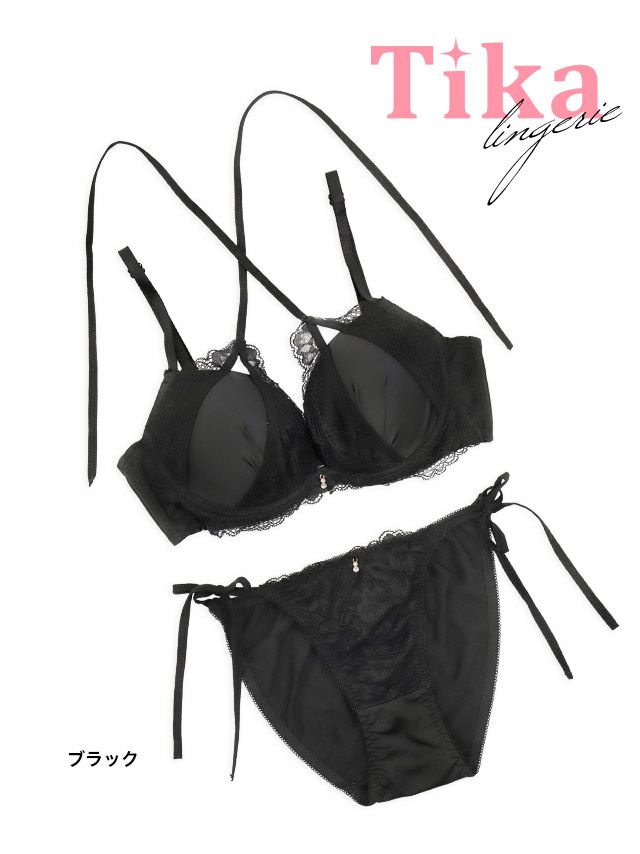 3. [勝負下着] ビジュー付きレース×サテンクロスソフトワイヤー脇高カップブラジャー&ショーツ2点セット