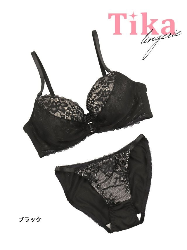 4. [勝負下着] フラワーレースチュールベールバックルブラジャー&ショーツ2点セット