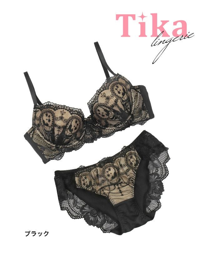ドレッシー&cuteな欲張りランジェリー♡ [勝負下着] ヌーディー 刺繍 レース ブラック 黒 脇高 ブラジャー ショーツ ランジェリー 2点セット