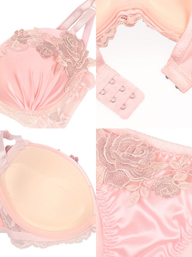 立体ローズ刺繍レースサテンカップブラジャー&ショーツ2点セットの詳細画像