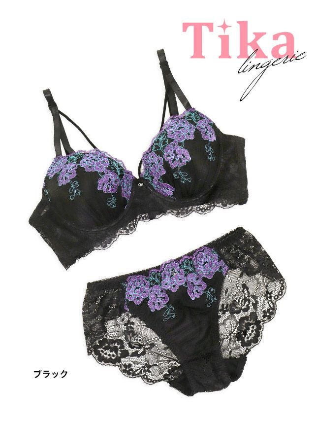 鮮やかな刺繍で視線を引き付ける♪ [勝負下着] ディープフラワー刺繍コードビジュー脇高カップブラジャー&ショーツ2点セット