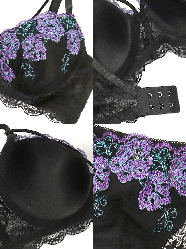 ディープフラワー刺繍コードビジュー脇高カップブラジャー&ショーツ2点セットの詳細画像