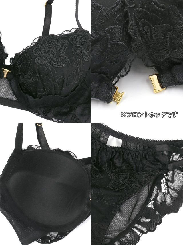 ローズ刺繍レースフロントホック脇高カップブラジャー&ショーツ2点セットの詳細画像