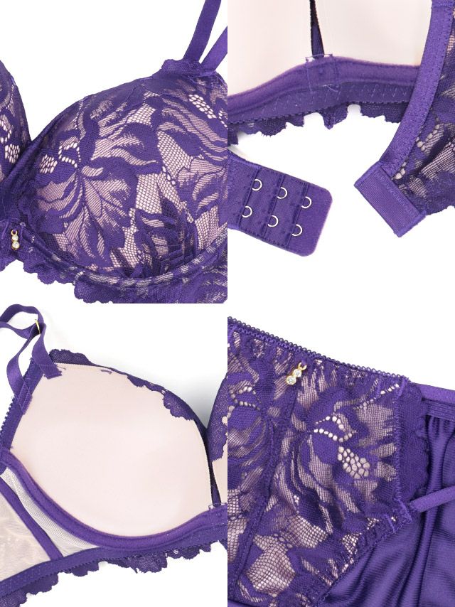 ディープパープルエレガントフラワー刺繍レース脇高カップブラジャー&ショーツ2点セットの詳細画像