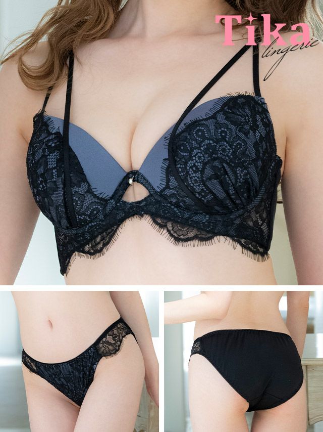 3. [勝負下着] ランジェリー 下着 アイラッシュレース カットアウト 脇高 ワイヤー ブルー ブラジャー ショーツ 2点セット