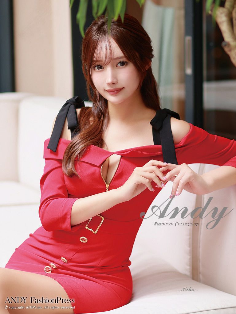 程良い肌魅せで大人の魅力を引き出す☆ [Andy/アンディ] 高級 肩出し 二の腕カバー 袖あり ウエストベルト ジップ ショルダーリボン ゴールドボタン バストカット 谷間魅せ タイトミニドレス