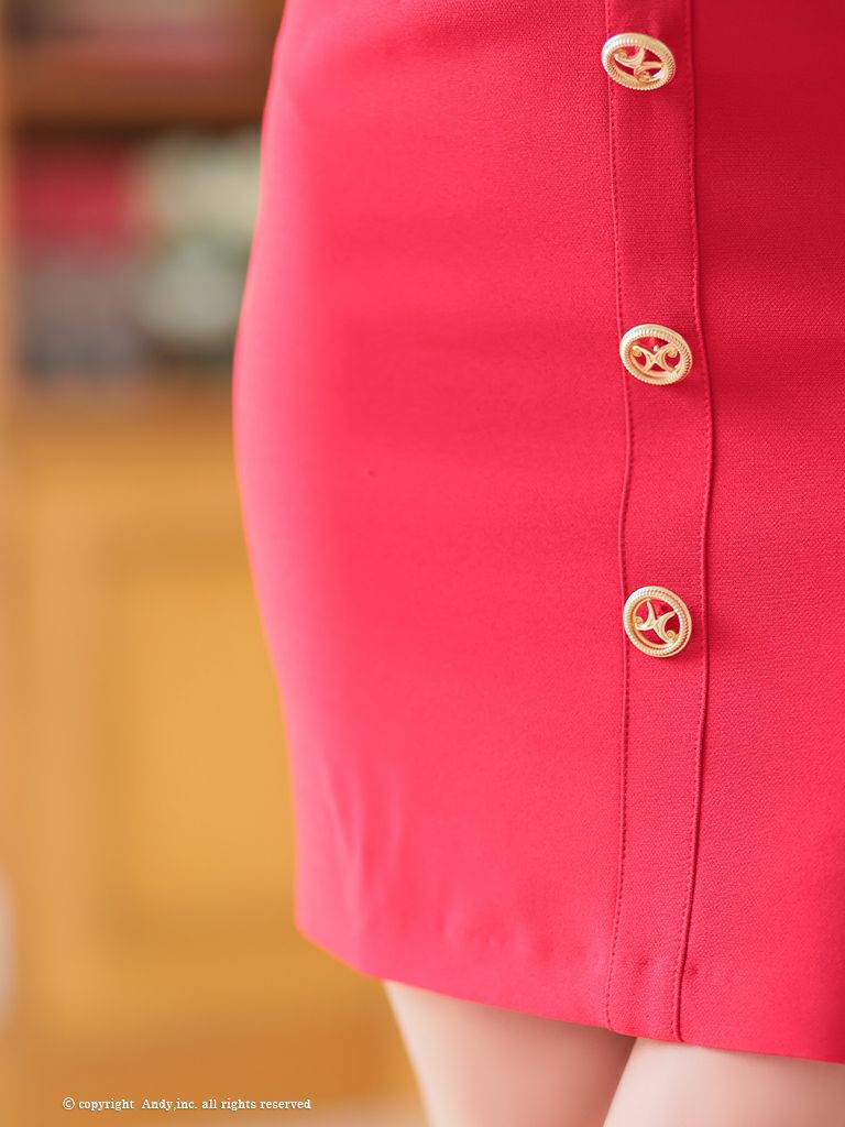 5. [Andy/アンディ] 高級 肩出し 二の腕カバー 袖あり ウエストベルト ジップ ショルダーリボン ゴールドボタン バストカット 谷間魅せ タイトミニドレス
