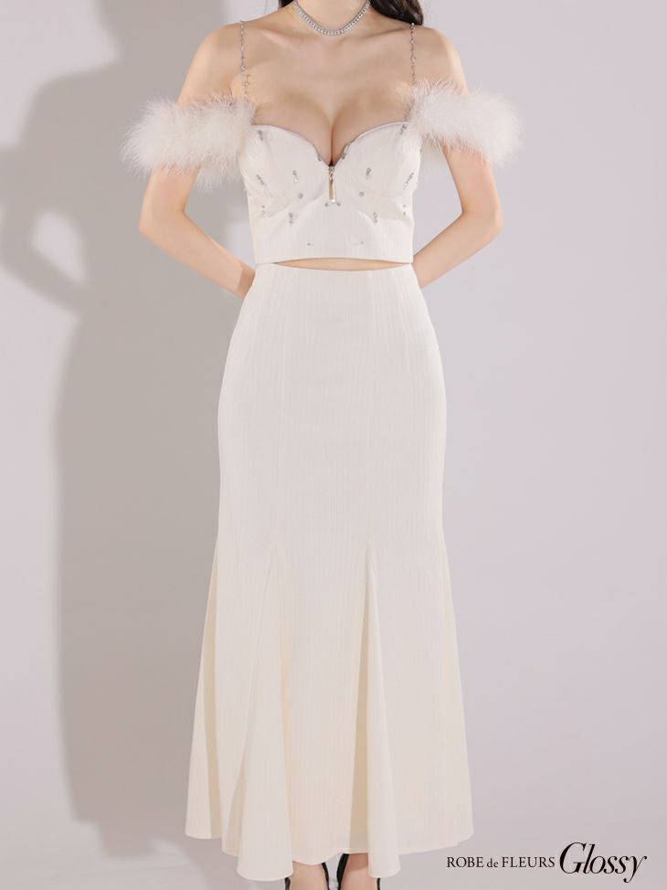 5. SALE [ROBEdeFLEURSGlossy/ローブドフルールグロッシー] 高級ショルダーフェザージップセットアップビジューキャミソールマーメイドロングドレス