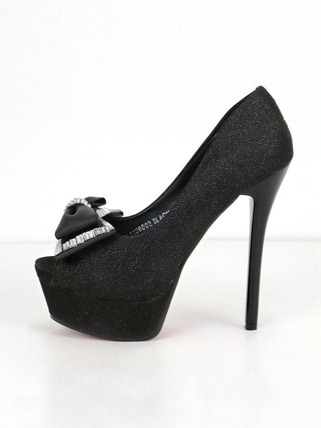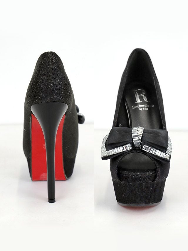 4. [SUPER SALE] リボンビジュー ハイヒール オープントゥ ラメ パンプス (ブラック) (14cmヒール)