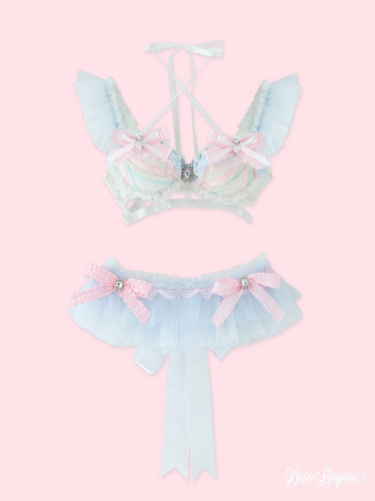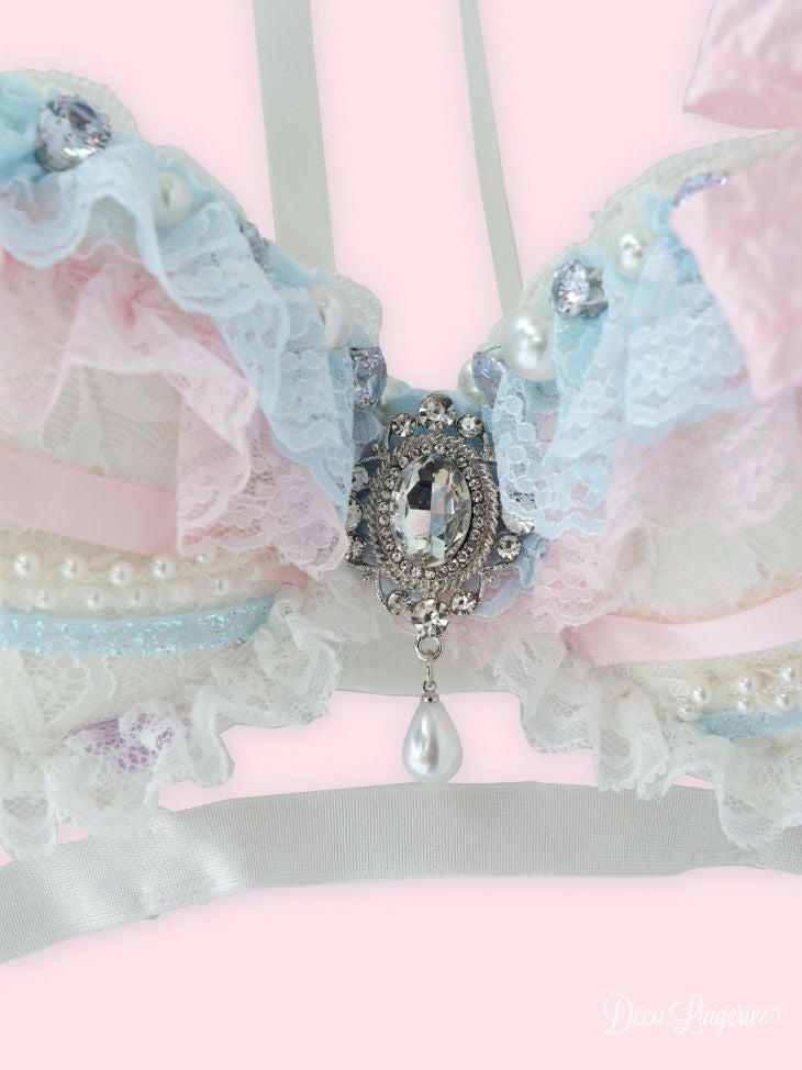 3. [DecoLingerie/デコランジェリー] [勝負下着] 高級 パステルカラー ビジュー パール リボン ラメ入りチュール スプリング ランジェリー 3点セット[ブラ/Tバックショーツ/ウエストフリル]