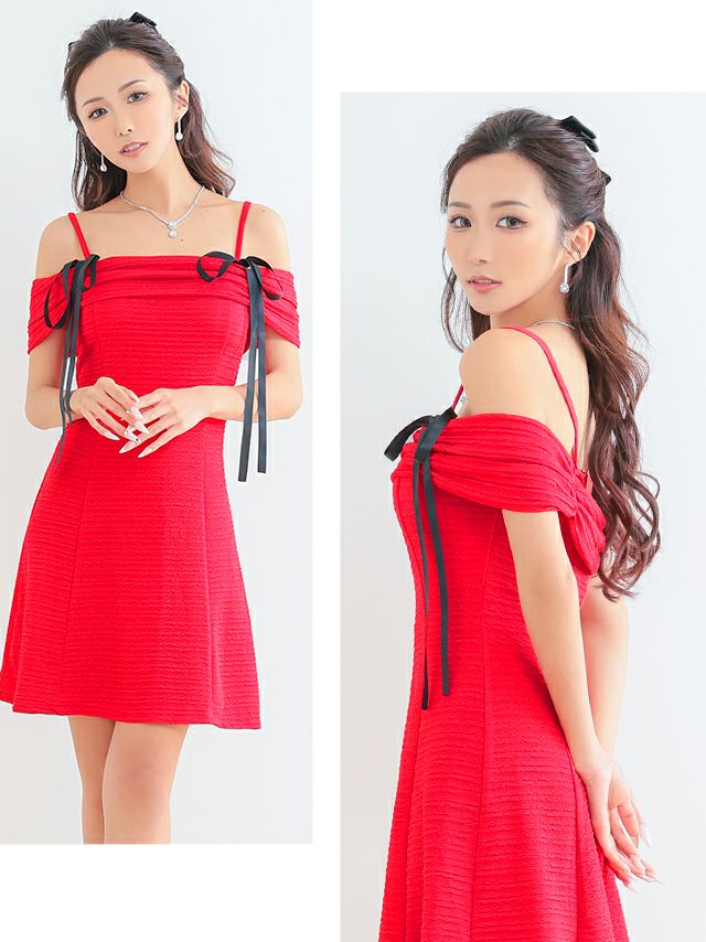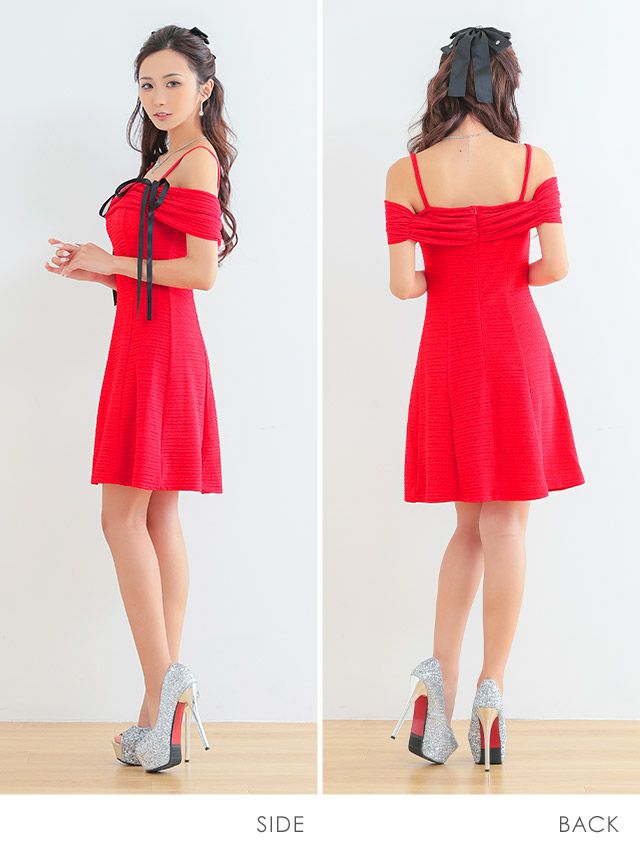 安い フレアミニドレス Aライン オフショルダー 大きいサイズ 背中魅せ 肩出し 二の腕カバー リボン付き ワッフルの詳細画像1
