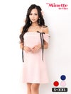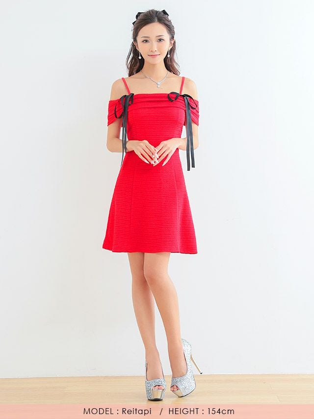 安い フレアミニドレス Aライン オフショルダー 大きいサイズ 背中魅せ 肩出し 二の腕カバー リボン付き ワッフルのメイン画像