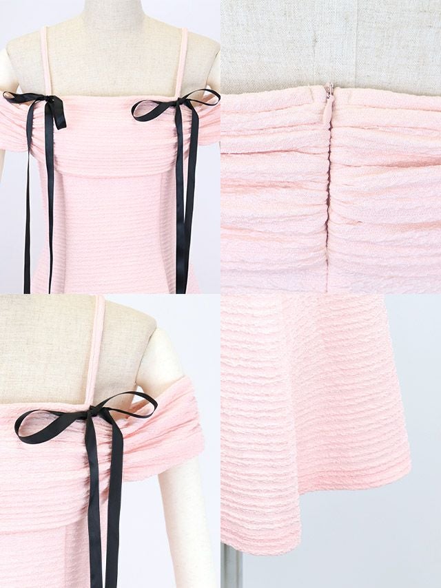安い フレアミニドレス Aライン オフショルダー 大きいサイズ 背中魅せ 肩出し 二の腕カバー リボン付き ワッフルの詳細画像2