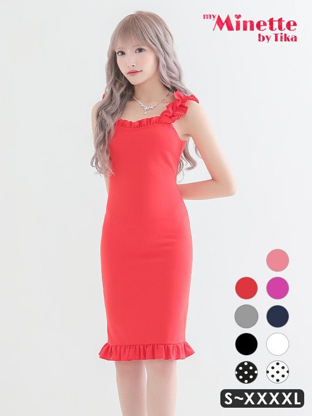 フリルデザインワンカラーノースリーブストレッチタイト膝丈ドレスのサイズ表 フリルデザインワンカラーノースリーブストレッチタイト膝丈ドレスのスペック表