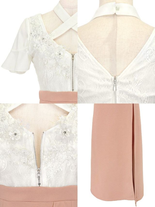 半袖クロスネックフラワーレースバストジップ切り替えサイドフリルスリットバイカラータイトロングドレスのイメージ画像3