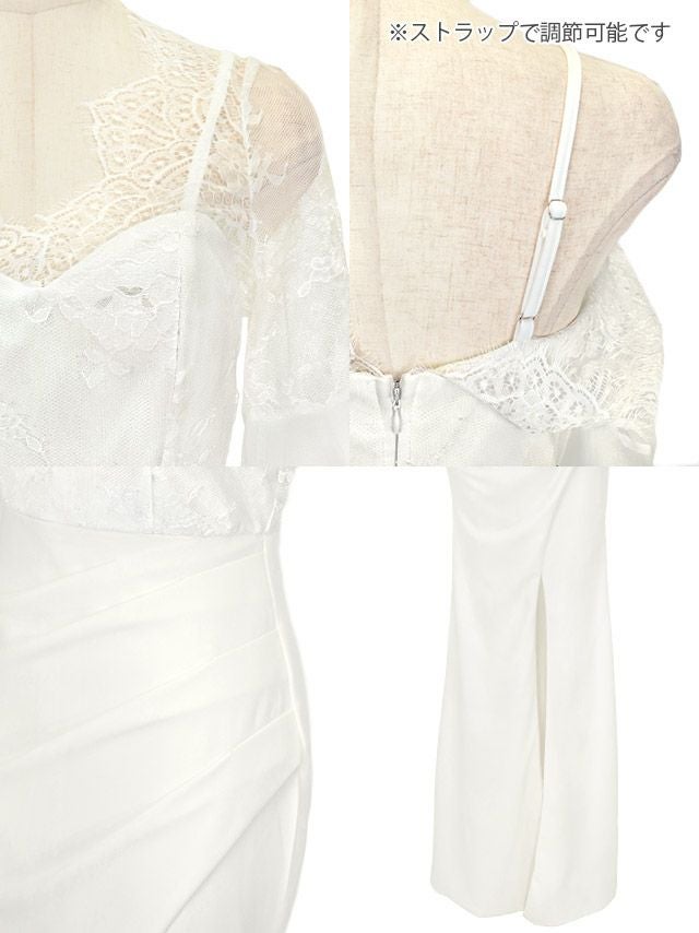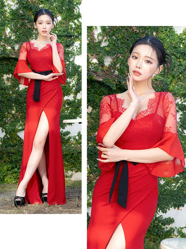 5. [SUPER SALE] ウエストリボン 袖あり 五分袖 ベルスリーブ スカラップレース ラップタイトロングドレス (Sサイズ~XXXLサイズ) (せいせい/キャバドレス着用)