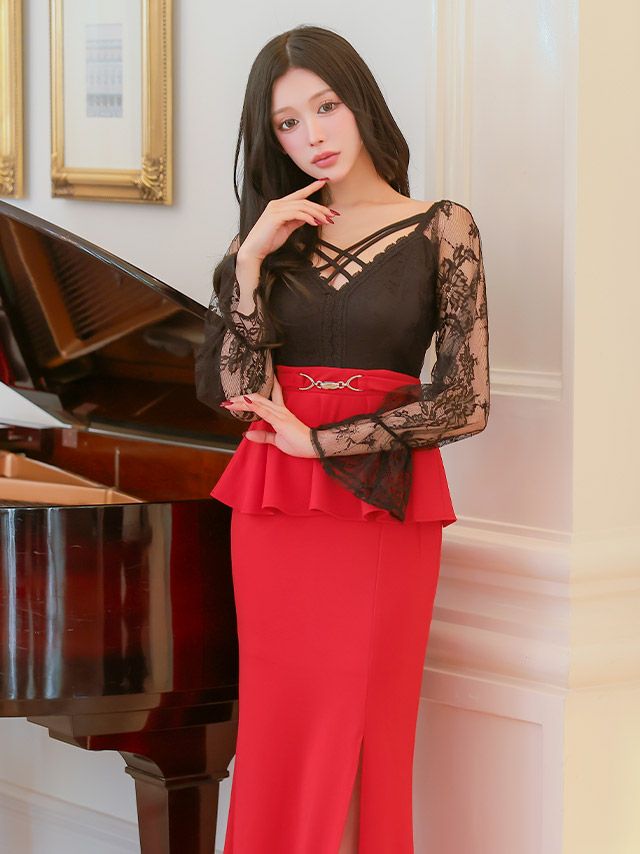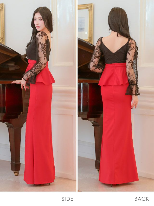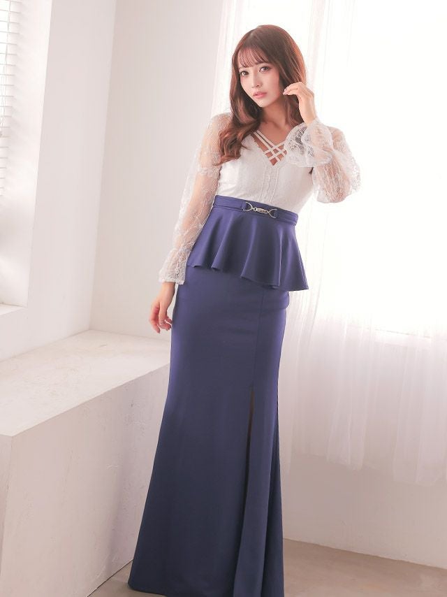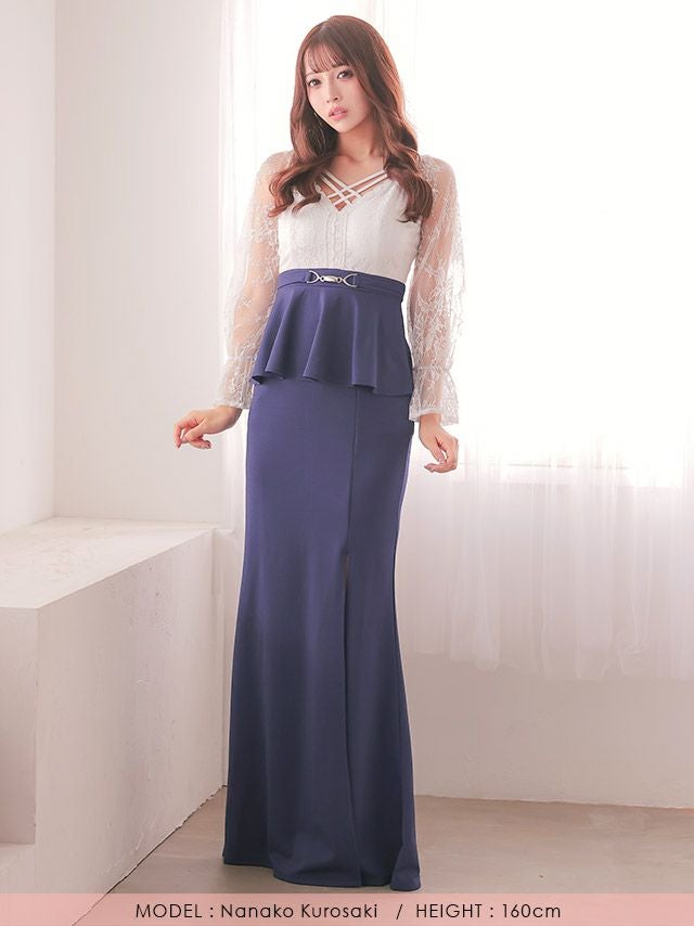 誘惑的なメリハリボディに♡ タイト ロングドレス 長袖 谷間 大きいサイズ レース 大人 スリット ストレッチ バイカラー ペプラム ウエストベルト パフスリーブ (せいせい着用)