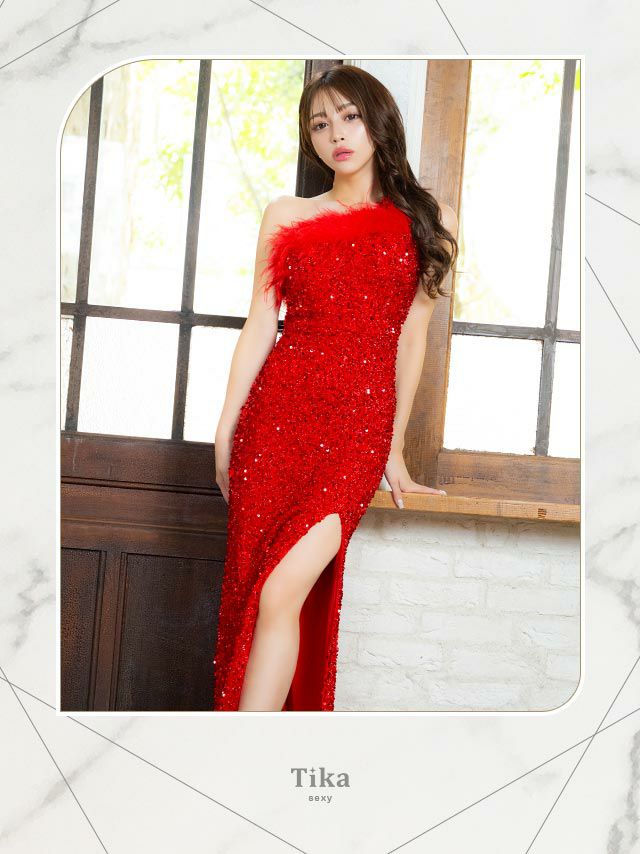 3. [SUPER SALE] バースデー ワンショルダーフェザーゴージャススパンコール胸元カバー タイトロングドレス (Sサイズ~XXLサイズ) (れいぽよ/キャバドレス着用)