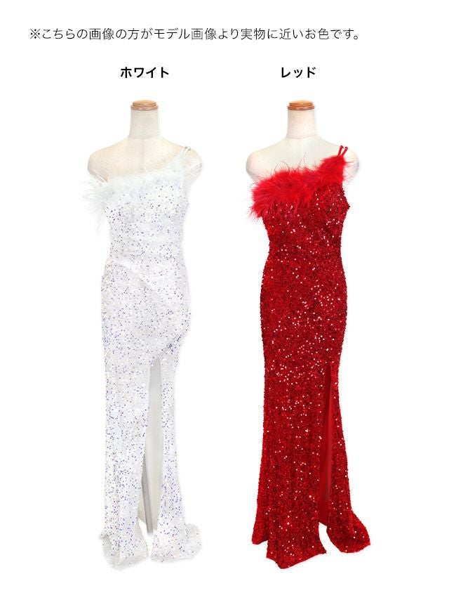 ワンショルダーフェザーゴージャススパンコールスリットタイトロングドレスのカラーバリエーション