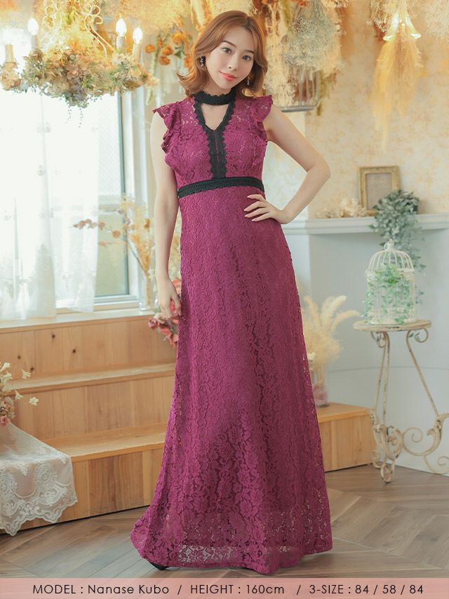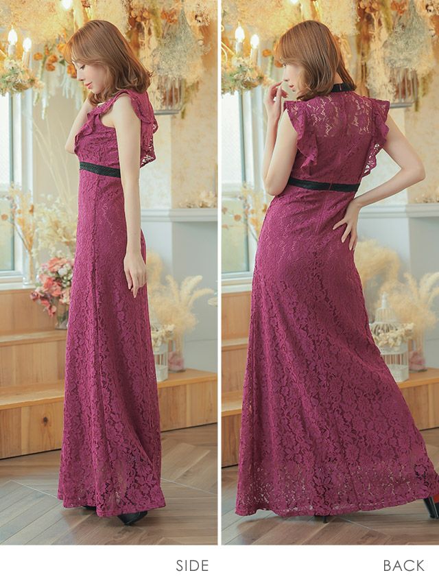 3. ノースリーブフリル袖デコルテカット総レースAラインロングドレス (Sサイズ~XXLサイズ) (ゆんころ/キャバドレス着用)