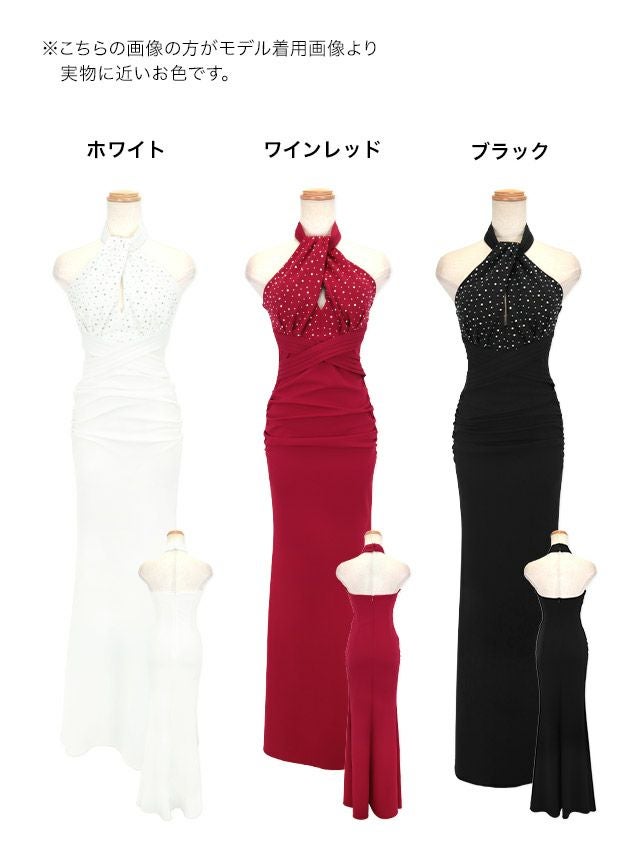 クロスホルターネックビジューワンカラーアメリカンスリーブスリットタイトロングドレスのカラーバリエーション