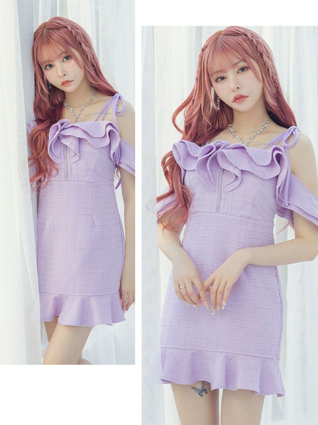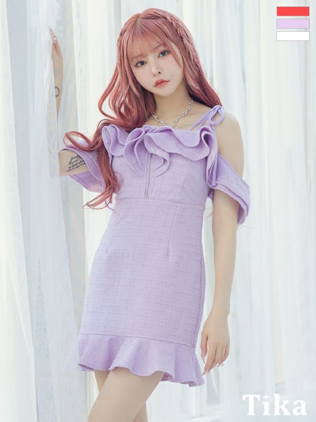 キャバドレス ミニ丈 大きいサイズ ワンピース 肩あきゴージャス胸元フリルシップツイードクリスマスタイトミニドレス